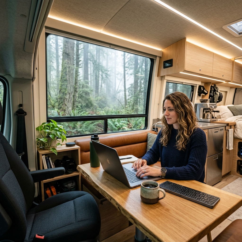 A:もちろんです。JAPAN ROAD TRIPの車両には大容量サブバッテリーや外部電源入力が完備されており、PCやスマートフォンの充電には全く困りません。お持ちのテザリングやWi-Fiルーターを使えば、そこは立派なハイテクオフィスへと変貌します。